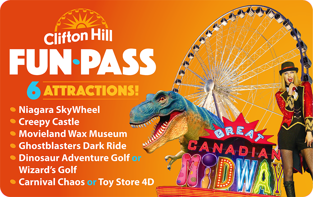 Six attractions, one low price! Save $30 off individual attractions and conveniently order online. The Clifton Hill Fun Pass includes admission to the Niagara SkyWheel, Creepy Castle, Movieland Wax Museum, Dinosaur Golf or Wizards Golf, Ghost Blasters, Toy Store 4D Ride or Carnival Chaos Ride. Fun Pass admissions can be used anytime within one year of purchase.