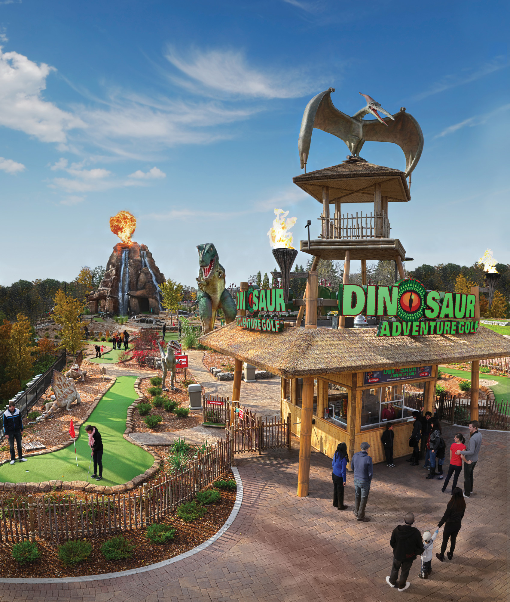 As one of the nation's largest miniature golf courses, Dinosaur Adventure Golf features two 18-hole courses: 'Raptor' and 'T-Rex', 3 distinct decorative ponds with fast-moving rapids and bubblers and a 50 foot high "active" steam-erupting volcano that lets golfers play directly through a realistically eerie, cavernous volcanic interior.