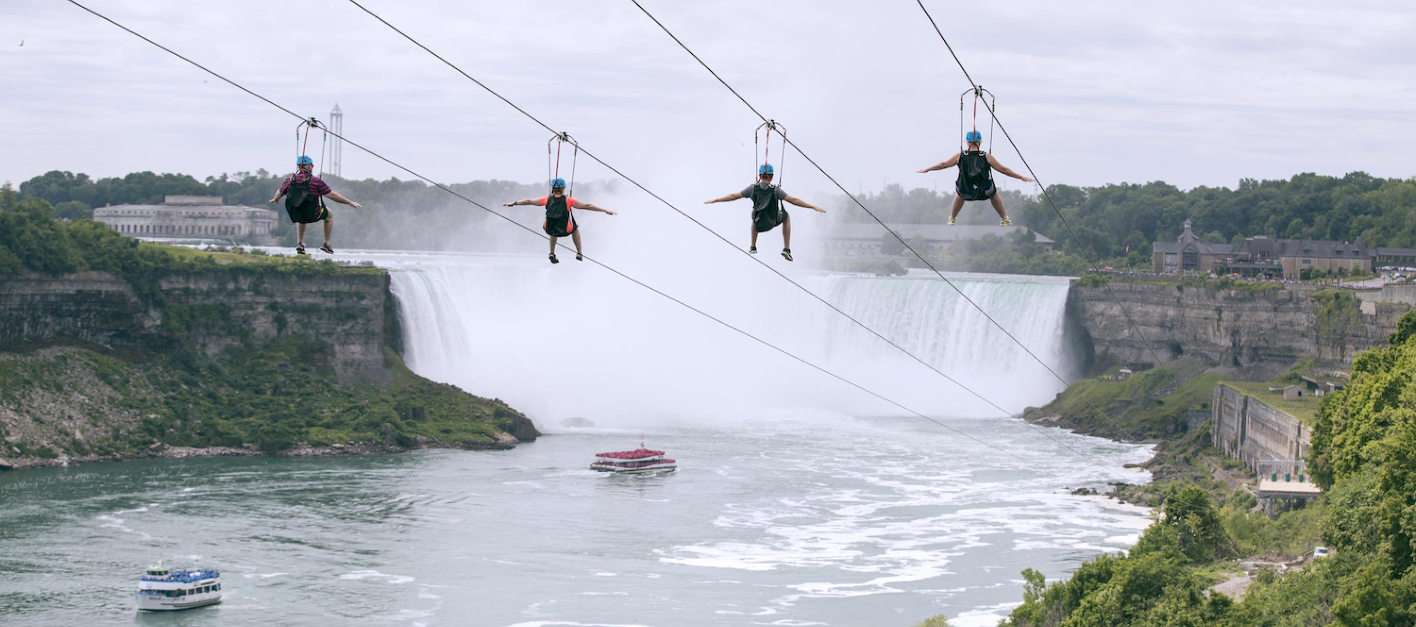 This flight without feathers is the coolest way for humans to soar across the sky – now with amazing world wonder views in Niagara Falls! On four parallel ziplines that face the American and Canadian Horseshoe Falls, riders dangle from a precarious 67 metre (220 foot) high vantage point. Our fully-guided experience adds thrill to the breathtaking panorama as gravity floats riders 670 metres (2,200 feet), at speeds of 70+ kph (40+ mph), along the edge the vast Niagara River gorge to the Falls observation landing. Feel the incredible force of nature on your face!